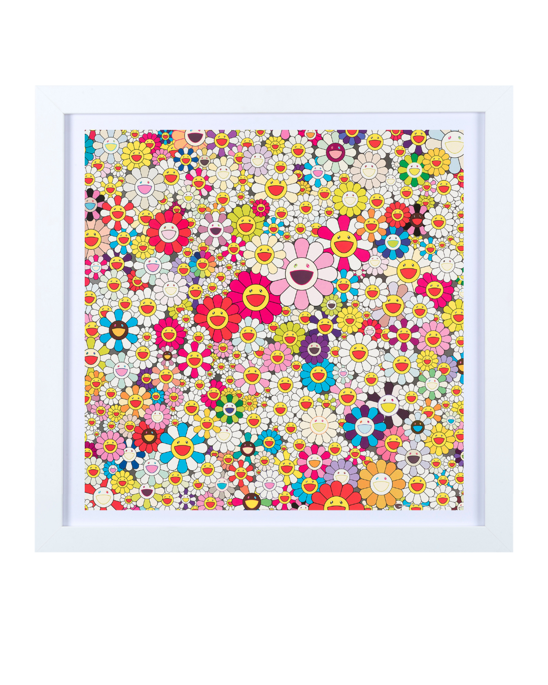 Takashi Murakami's work “Flowers in Heaven”, created in 2011, is a limited edition offset silkscreen print of 300, each signed and numbered by the artist. Measuring 68x68 cm, this work is a vibrant and iconic celebration of the Superflat aesthetic, in which bright colors, graphic simplicity and a sense of repetition create an overwhelming composition.