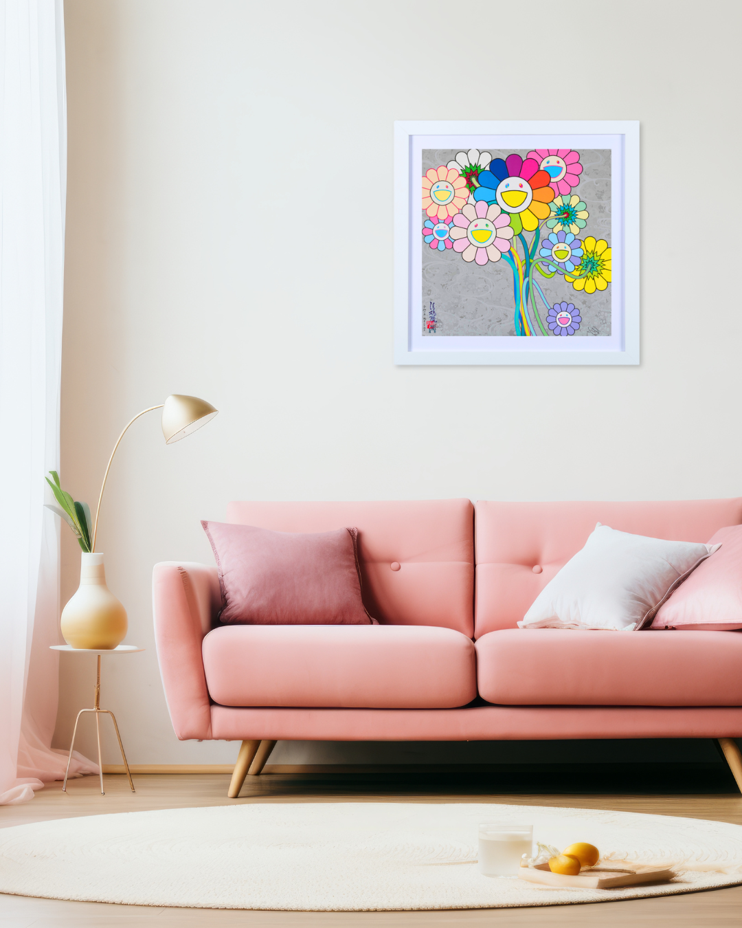 This work fully reflects Murakami’s visual language, where Japanese artistic tradition merges with pop culture and references to contemporary society. The serial repetition of the flowers and their graphic uniformity highlight the artist’s connection to the idea of art as a universal and accessible image, capable of balancing refined aesthetics, mass production, and a collectible dimension.
