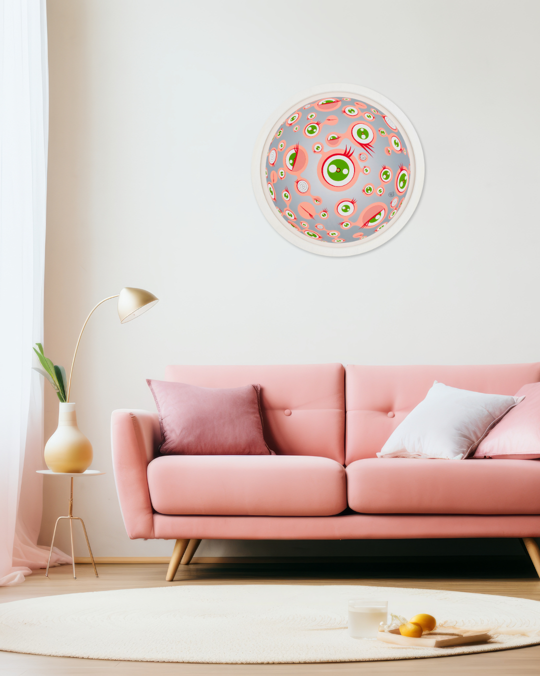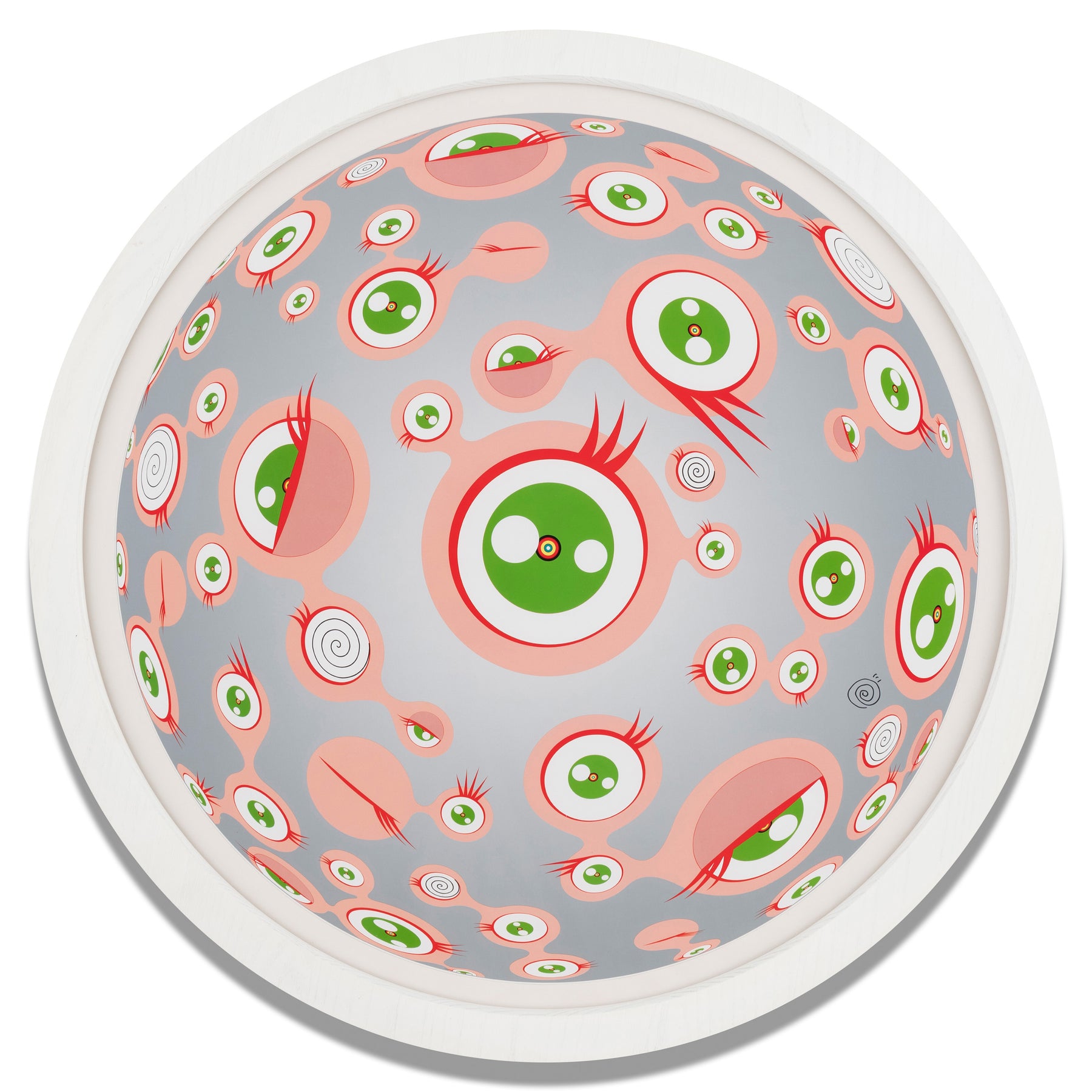 The floating, rounded forms evoke the image of jellyfish—as suggested by the title—but also reflect Murakami’s obsession with detail and serial repetition, key elements of the Superflat movement he himself theorized. The eyes, rendered in soft pastel tones with green and red accents, appear to watch the viewer from every angle, transforming the surface into a constantly shifting visual field. A sense of suspension and lightness is reinforced by the perfect symmetry of the composition, striking a balance between unease and fascination.